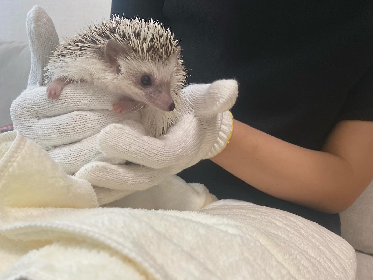 現在当店で飼育しているハリネズミたちの中から、オス、メス、大人、子供と順に触れ合ってもらい、「実際に飼育する際のイメージがついた」と言ってくださいました。