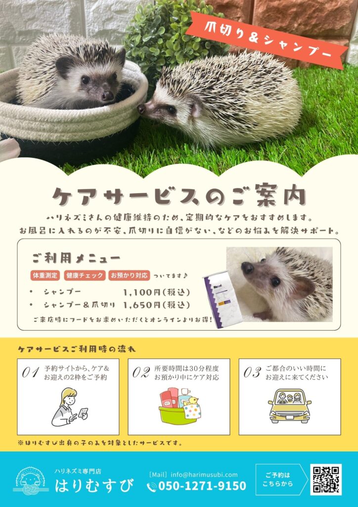 当店では、ハリネズミの爪切りやシャンプーのケアサービスを行っております。